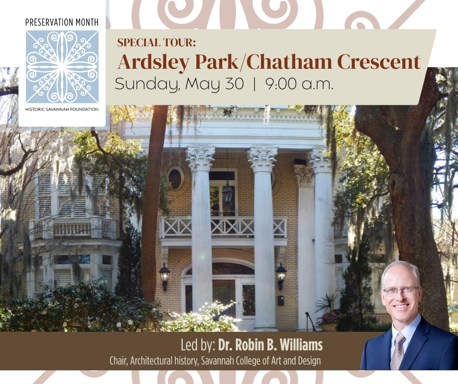 Join Robin B. Williams, professor and Chair of the Architectural History Department at the Savannah College of Art and Design (SCAD) and HSF for an exclusive walking tour of Ardsley Park and Chatham Crescent on Saturday, May 30th at 9:00 am. This special tour will provide an in-depth look at the many architecturally significant homes in the Ardsley Park/Chatham Crescent Historic District, which boasts houses dating from 1910 through the 1930s, and will also inform about the neighborhoods’ conception and unique urban planning, design, and landscape features.