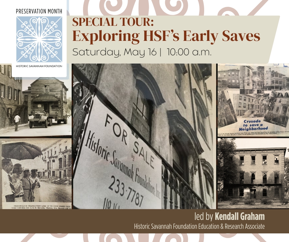 Join HSF’s Education and Research Associate Kendall Graham for a walk through Savannah’s early preservation history! This special tour, in honor of Preservation Month, will showcase some of the homes saved by HSF after the Davenport House. Follow in the footsteps of these early preservation success stories, learn the history of HSF’s Revolving Fund and why it still matters today, and hear lesser-know historical anecdotes about our city’s buildings and residents.